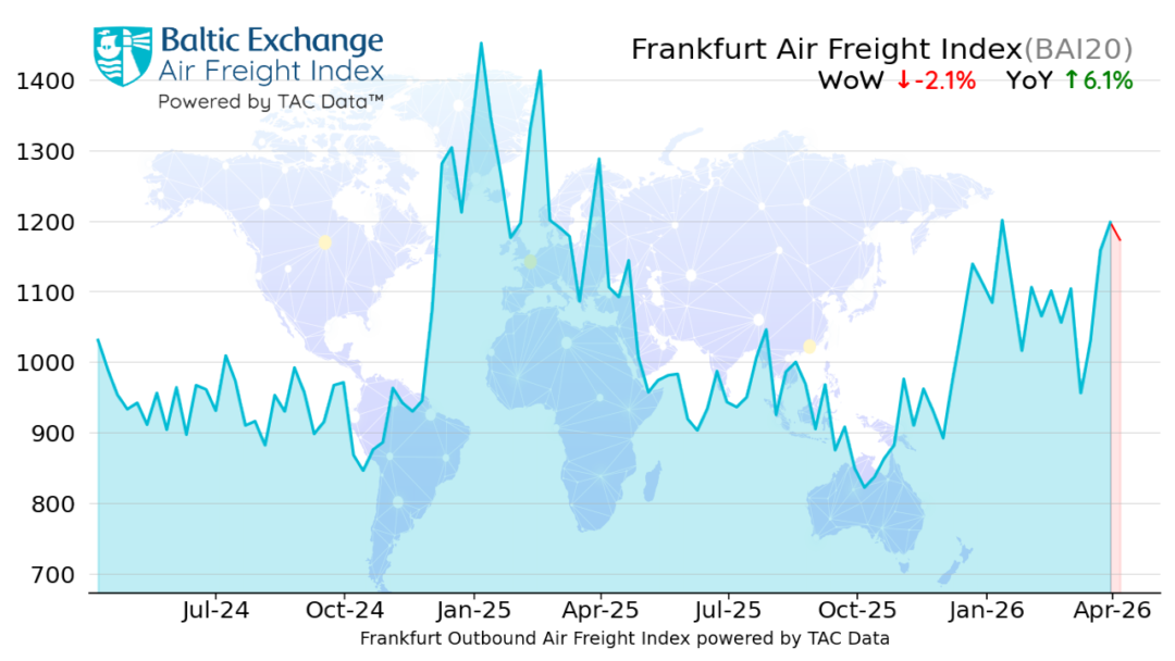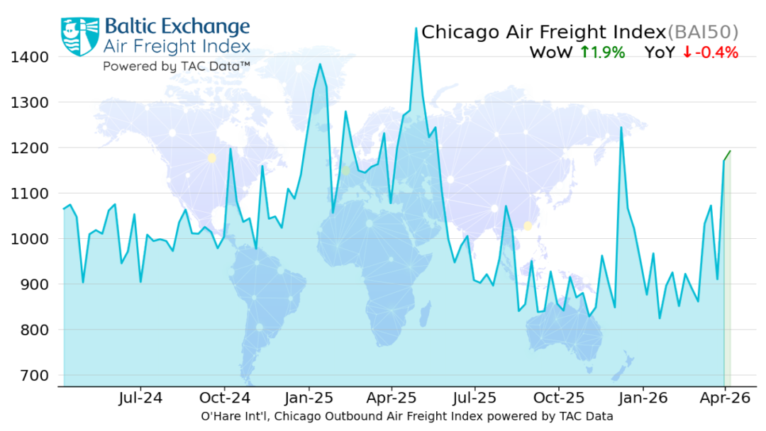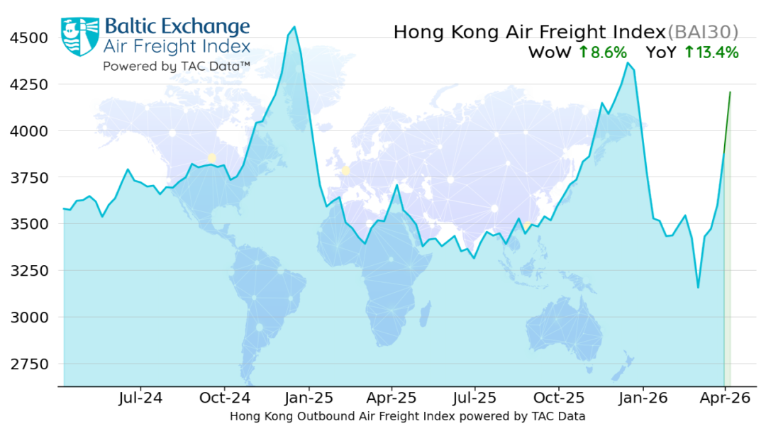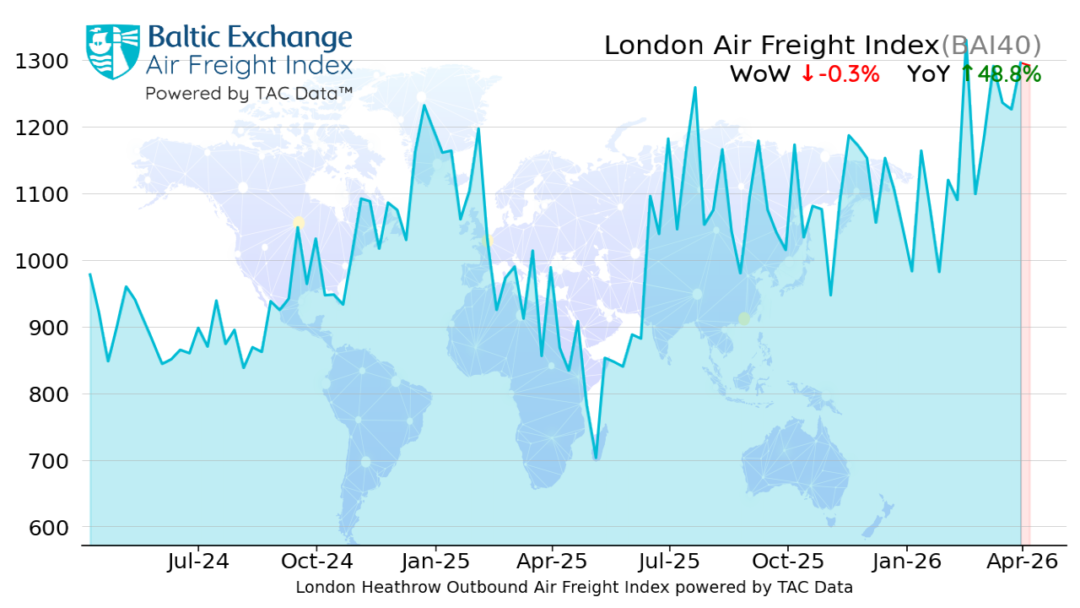 - The global Baltic Air Freight Index (BAI00) rose by +5.1% in the week to April 6, leaving it up +15.8% year-on-year.
