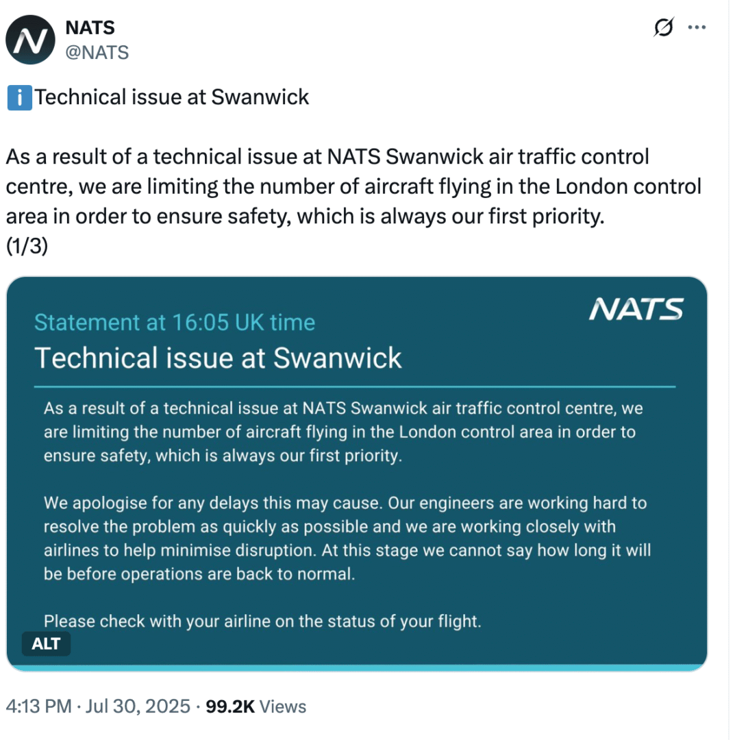 Air traffic in the London control area is facing delays following a technical issue at NATS Swanwick, the UK’s air traffic control centre. The problem, confirmed in a statement issued at 16:05 UK time on July 30, has led to a restriction on the number of aircraft permitted to fly in the region.