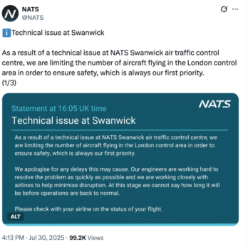 Flights delayed as technical fault hits London air traffic control