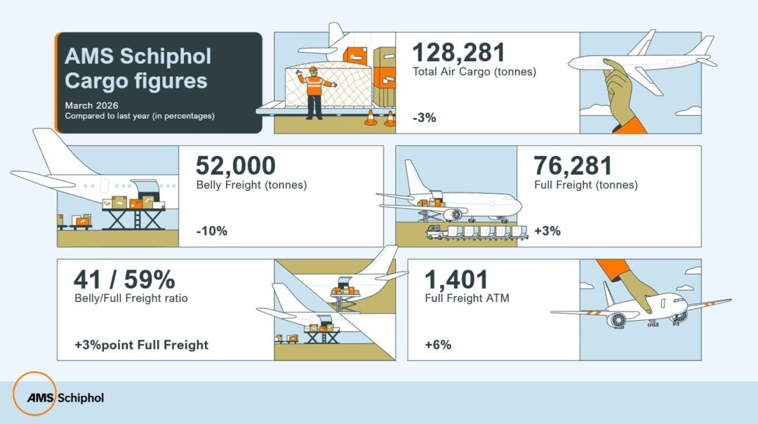 - Amsterdam Airport Schiphol handled 361,829 tonnes of cargo in Q1 2026, up 5% year-on-year, despite a March decline driven by Middle East disruption.